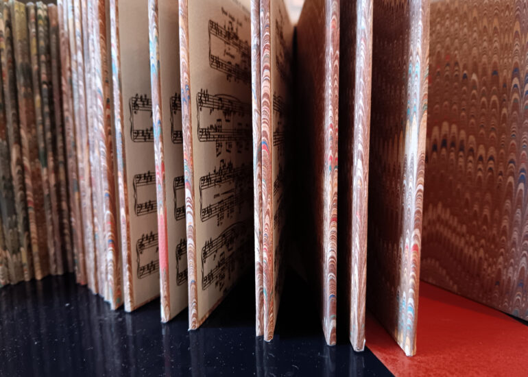 La typographie en caractères mobiles et la mise en livre sont de Mark Lintott. Les beaux papiers marbrés à la cuve sont la création de Marie-Anne Hermaide.