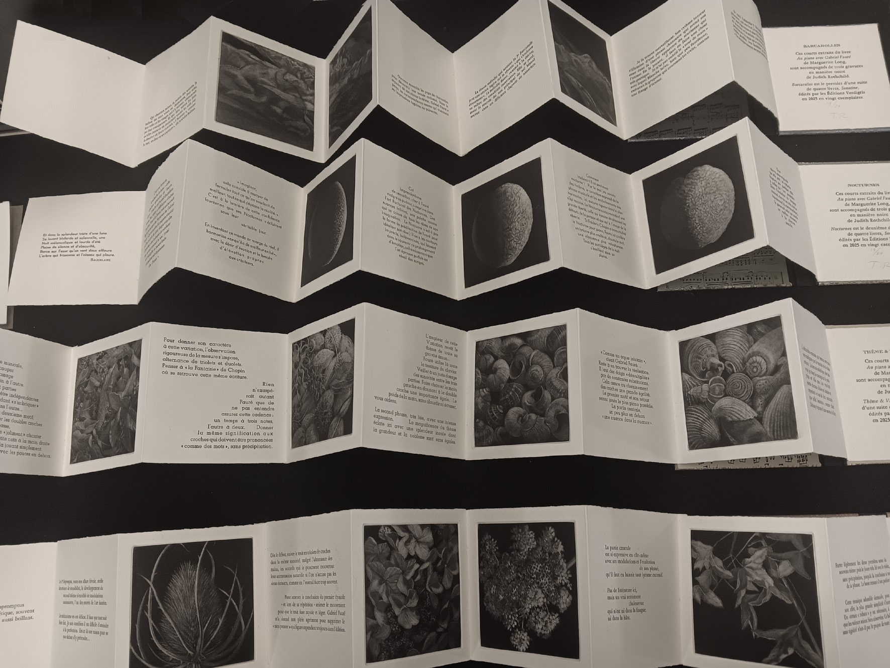 Les textes de Marguerite Long sur la vie et la musique de Gabriel Fauré, tirés de Au piano avec Gabriel Fauré, ont inspiré cette suite en quatre parties : Barcarolles, Les Nocturnes, Thème et Variations et Les Impromptus. Cherchant à faire un pont entre l’esprit de la musique et de l’image, les 14 gravures en manière noire de Judith Rothchild ouvrent le jeu et posent les questions.